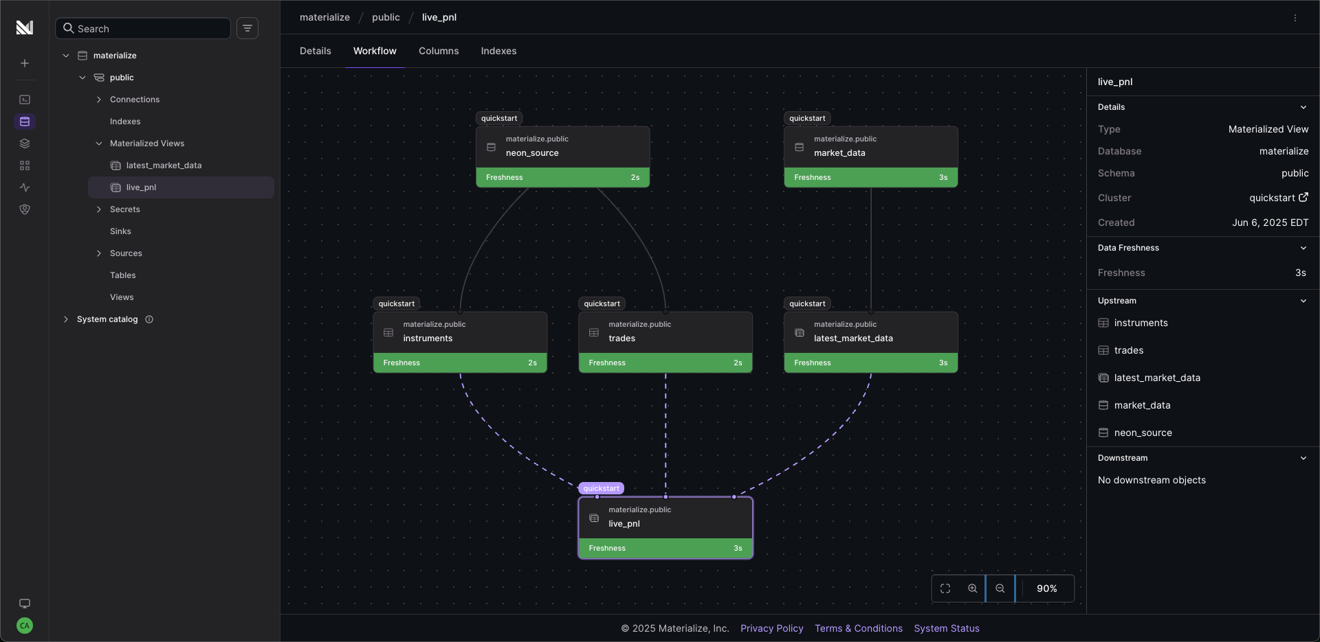 With the streaming database chosen, I spun up a Materialize Cloud instance — a managed service that’s secure, scalable, and production-ready out of the box. Then, I needed data: trades and instruments from Postgres, and market prices from a live feed.
