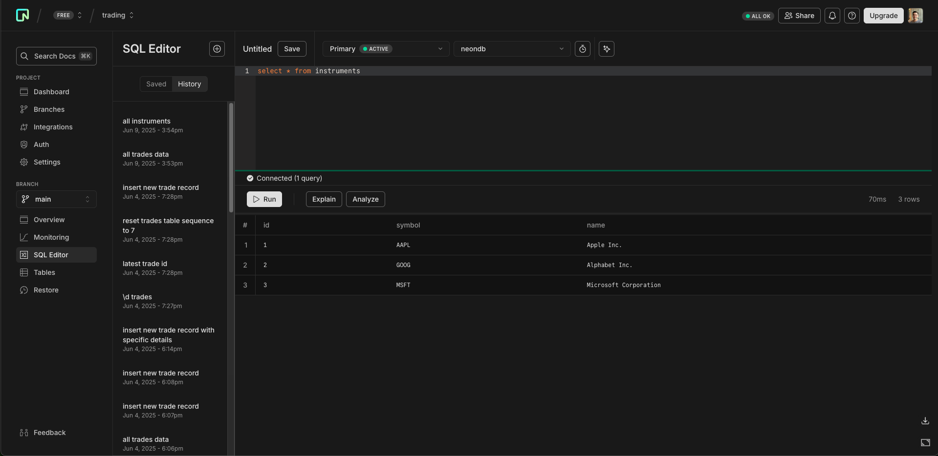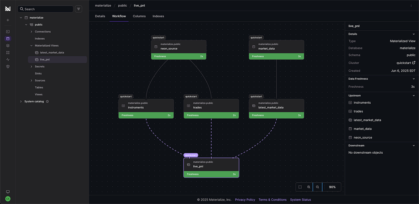 For trades and instruments, I used Neon — a managed Postgres service that’s quick to set up and has a free tier. I used Claude to generate the tables and some fake data, and created a ‘publication’ so Materialize could subscribe to updates in real-time. I registered Neon as a source in Materialize, and the data was live.
