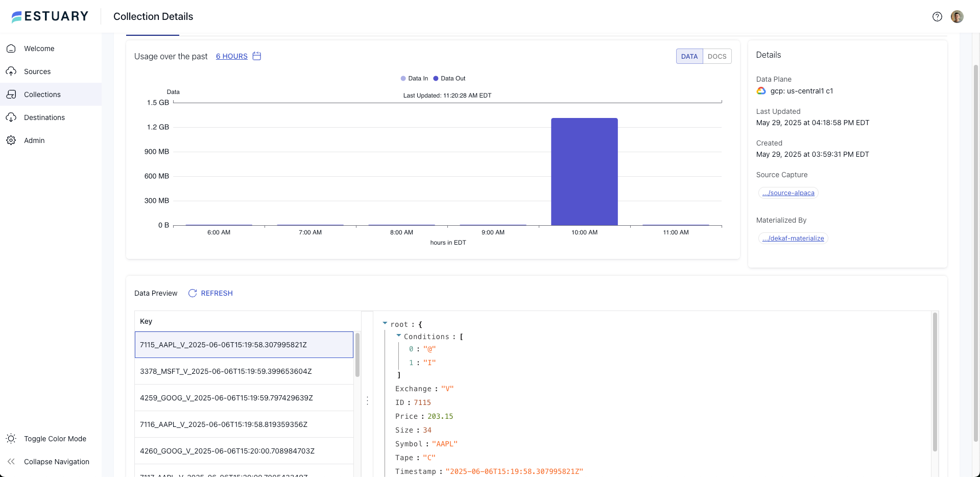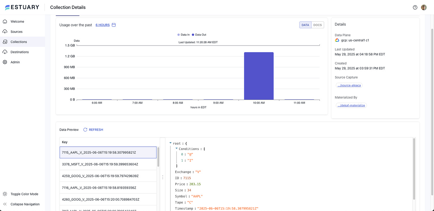 That’s when I found Estuary Flow: a real-time ETL tool with native support for both Alpaca and Materialize. Within a few minutes, I’d configured Estuary’s Alpaca connector for the IEX trades stream, mapped it to a Kafka topic, and registered it as a source in Materialize. Live prices were streaming in.