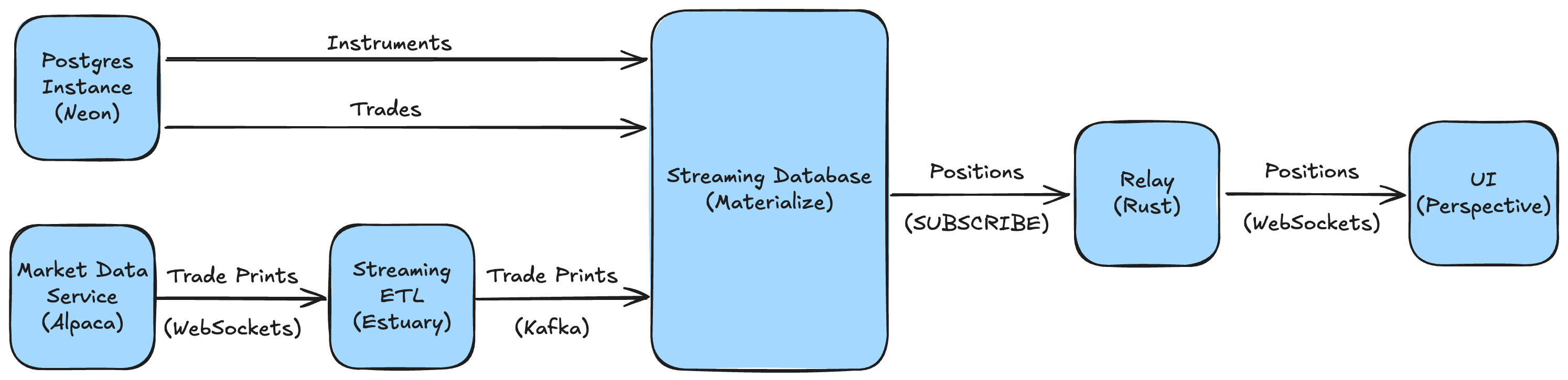 This post continues from Part One, where I built a real-time core for a positions UI using Materialize. Trades, instruments, and market data were flowing into a live view of quantity, market value, and theoretical P&L, with millisecond-level latency. The next step was getting that data into a UI in real time, with minimal code and infrastructure.