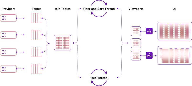 Finally I explored view servers, which are common in many financial markets applications. These components typically stream data to frontends over WebSockets, with built-in rate limiting and access control. Genesis and Deephaven, for example, both feature UI servers as part of their larger platforms (e.g. Genesis’ Data Server), but these aren’t available as standalone components.